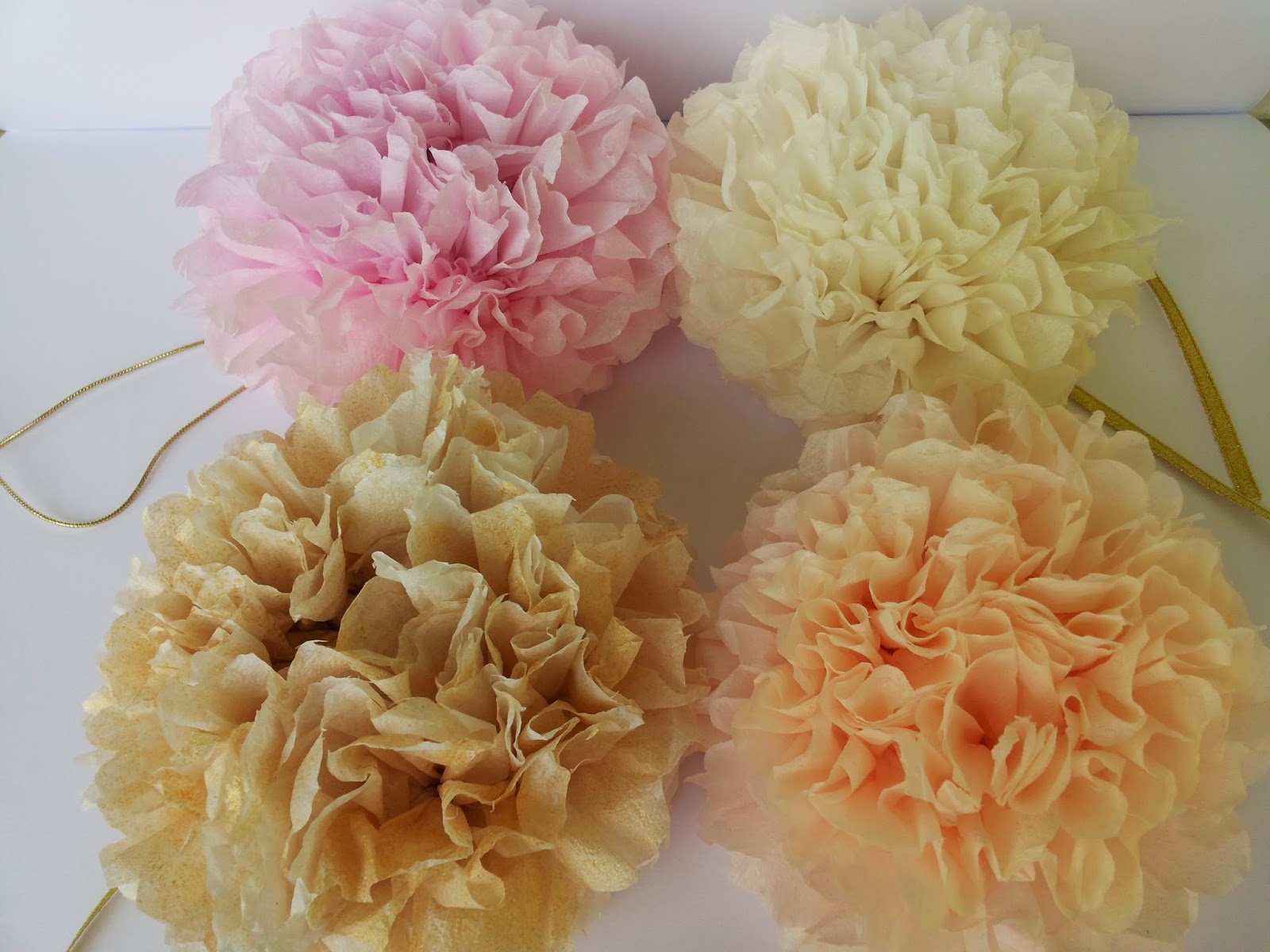 Hello, my last completed project was to decorate a wedding.. with pompoms in pale pink, pale peach, ivory and gold ... The work was slow and hard, as you know I hand dye the paper in desired colors ... The result :